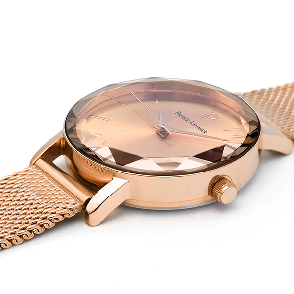 Đồng hồ này có vỏ tròn bằng thép không gỉ đường kính 30 mm, tông màu vàng hồng với hiệu ứng tia nắng mặt trời. Các kim và chỉ số của nó cũng có màu vàng hồng, mang lại cho nó sức hấp dẫn đặc biệt. Tất cả các chi tiết cùng nhau tạo thành một mẫu đồng hồ nữ rất nữ tính.