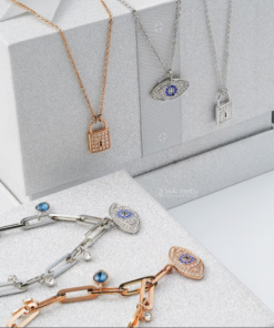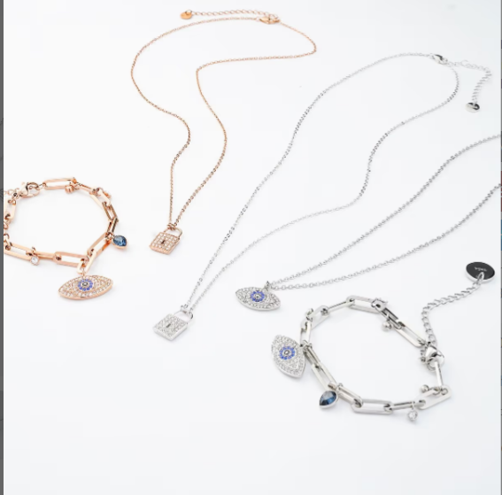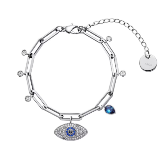 Mẫu vòng đeo tay Saga 00149-SVBL-SL phiên bản tone màu vàng thời trang, thiết kế sang trọng hình mắt thần Horus tượng trưng cho sức mạnh và sự bảo vệ, đính các viên đá pha lê Swarovski thời trang cho phái đẹp.